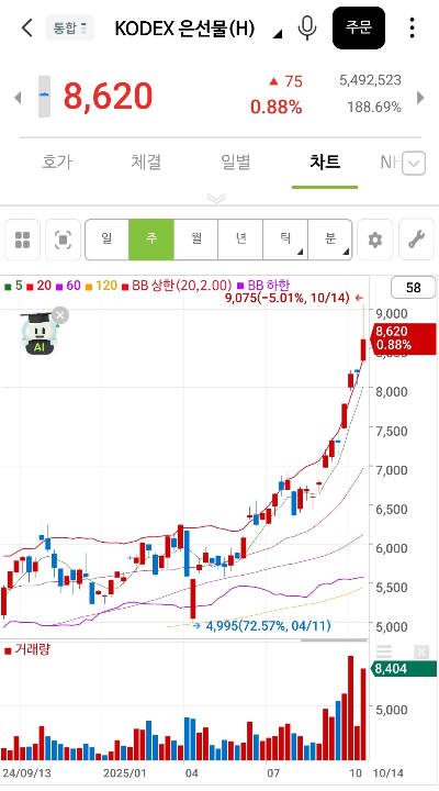 그래서 올해 초 본인은 금은 올라도 너무 올랐다며 분명 금이 오르면 은도 따라 오를 거라면서 올해 초 금 투자 대신 은 ETF 투자를 시작했었다. 그런데 몇 달 동안 지지부진한 수익에 참지 못하고 매도를 해버렸는데 웬걸 그 이후로 줄곧 상승하더니 50%가 넘게 올라 버렸다.